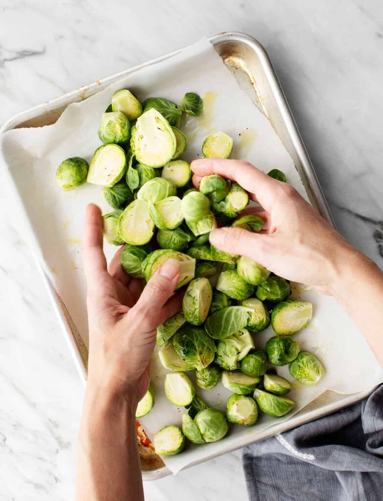 3. Spread the sprouts in a single layer on the baking sheet, making sure they are not crowded so they roast properly.