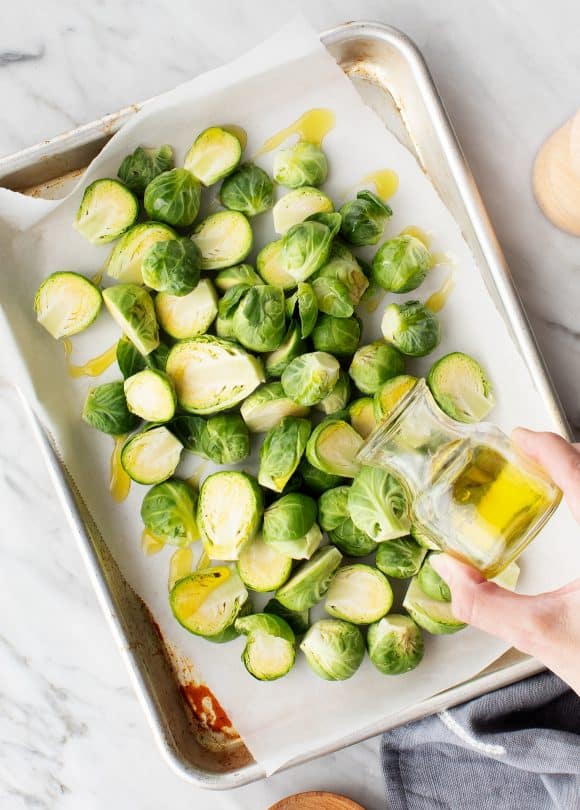 Slice the Brussels sprouts in half, then toss them with olive oil, salt, and pepper until they are well coated.