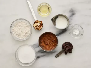 - Add the flour, sugar, cocoa powder, baking powder, milk, and olive oil directly to a large microwave-safe mug.