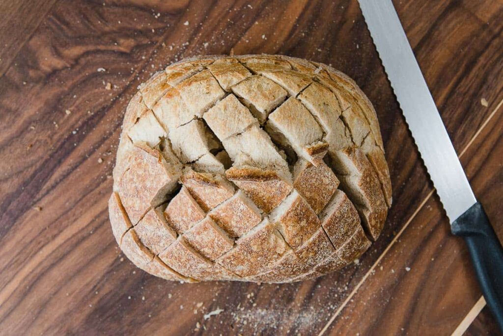 - Use a serrated knife to slice the bread diagonally into even sections without cutting all the way through, then rotate and repeat to create a crosshatch pattern.